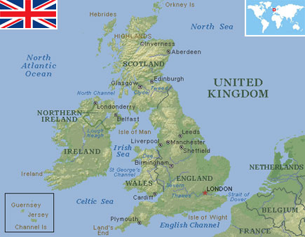 The United Kingdom of Great Britain and Northern Ireland is commonly known as the United Kingdom (UK) or Britain and is a sovereign state located off the north-western coast of continental Europe. The United Kingdom consists of Great Britain (England, Scotland and Wales), plus the six counties of Northern Ireland. The Isle of Man and the Channel Islands (principally Jersey and Guernsey) are also parts of the British Isles, but not officially part of the UK. Apart from this, the UK is also surrounded by the Atlantic Ocean, the North Sea, the English Channel and the Irish Sea.